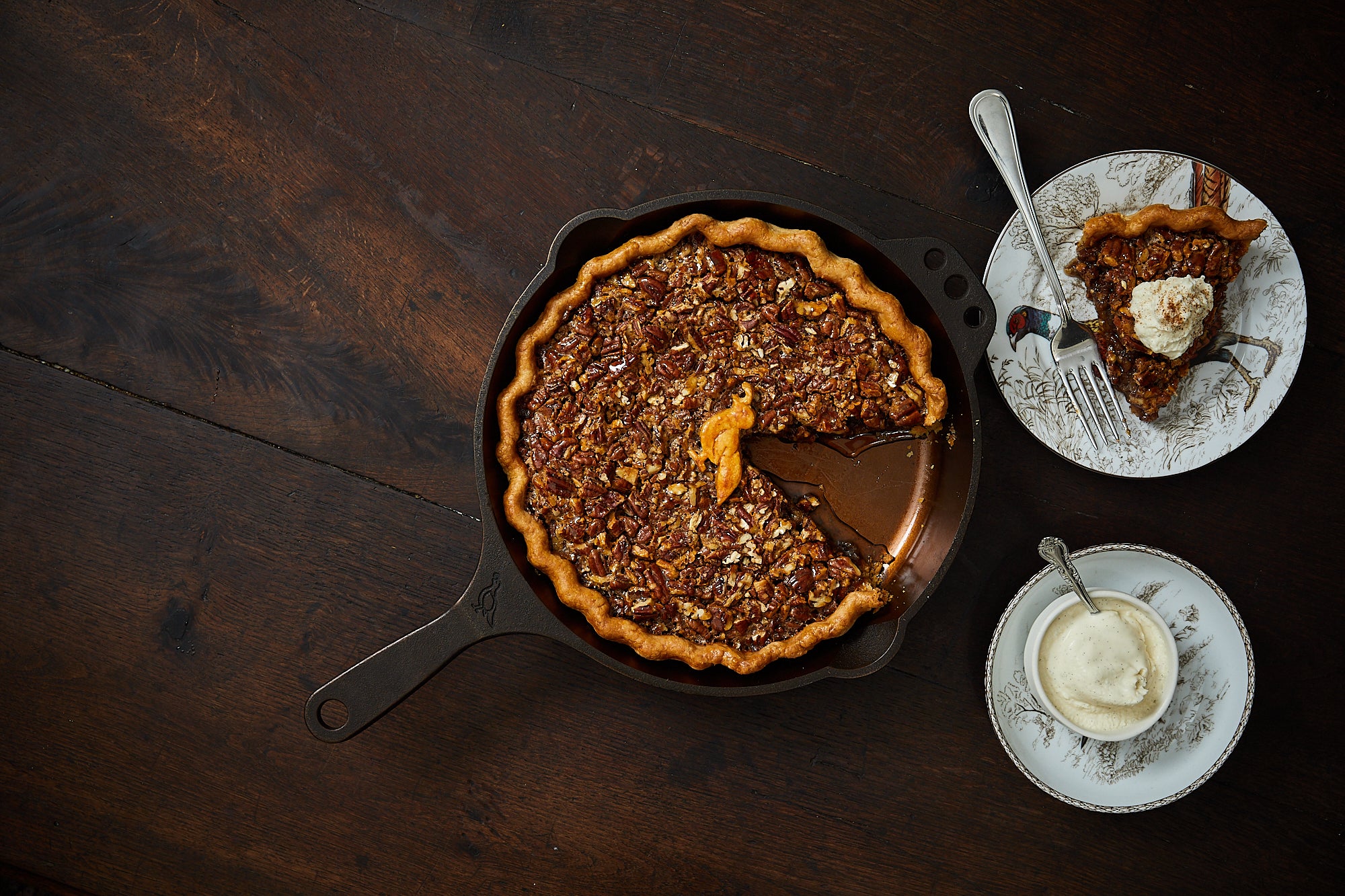 Scatter pecans into the warm pre-cooked pie crust. Carefully pour the filling over the top. Bake in preheated oven for 60-75 minutes, just until set. Allow to cool completely in the skillet before slicing.